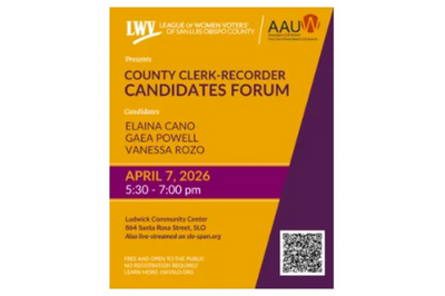 If you missed the County Clerk-Recorder Candidates Forum, moderated by the League of Women Voters of San Luis Obispo County, in partnership with AAUW Atascadero and AAUW Five Cities–Pismo Beach, that's ok!